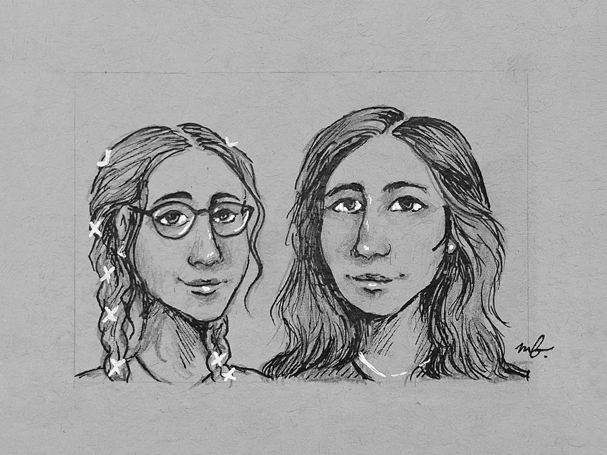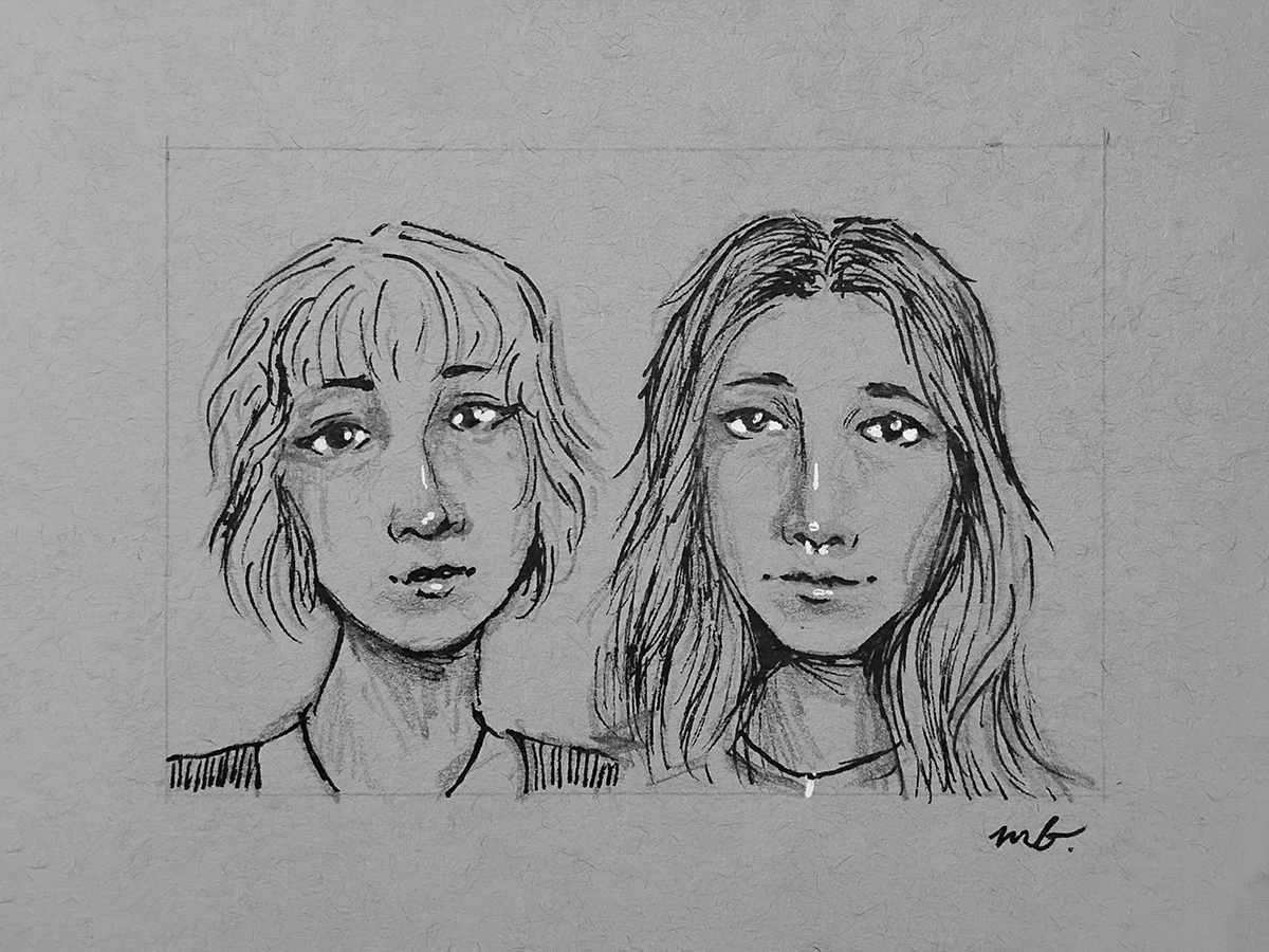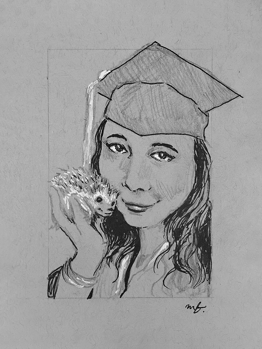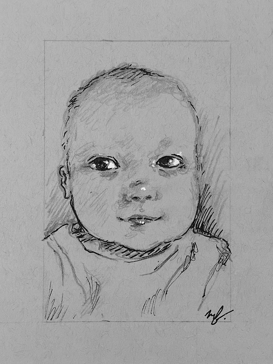 If you’d like to order your own custom mini portrait, they are available at $20 for a single face (animal or human), or $35 for two faces in one portrait (see photos for examples). Larger full-color portraits are also available, with variable pricing depending on the complexity of the project.